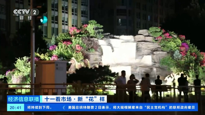 总台央视记者王闻聪:今年北京天安门广场中心花坛的大花篮和长安街沿线的10组立体花坛,都在国庆中秋假期增添了夜间照明设施,让夜晚的花坛更加引人注目。北京东单东南角的“黄河赞歌”立体花坛,也被称为是“会唱歌的花坛”。在花坛上不仅能看到微观的壶口瀑布、奔腾的骏马、载歌载舞的人群,还有水雾、音乐等声光电技术,更加逼真地还原了黄河之水天上来的气势。晚上八点,这里仍有大量游客前来拍照打卡。